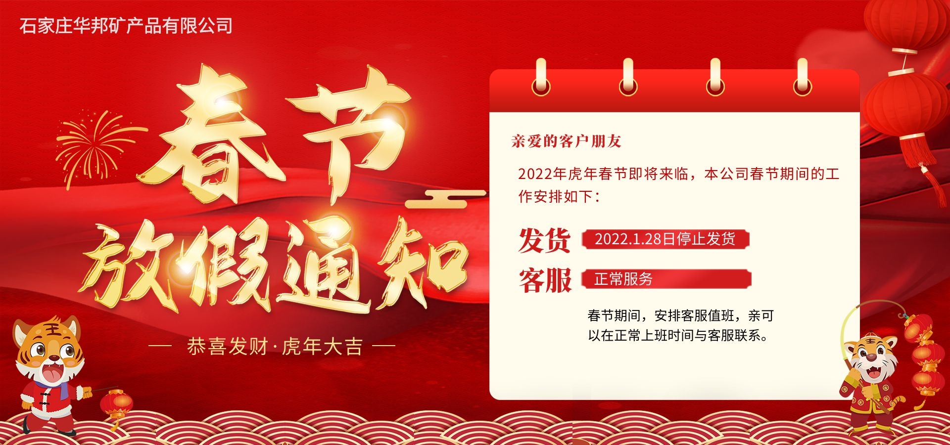 在此,石家莊華邦礦產(chǎn)品有限公司全體員工向廣大的新老客戶,向支持華邦的新老朋友,致以新年的問候:…